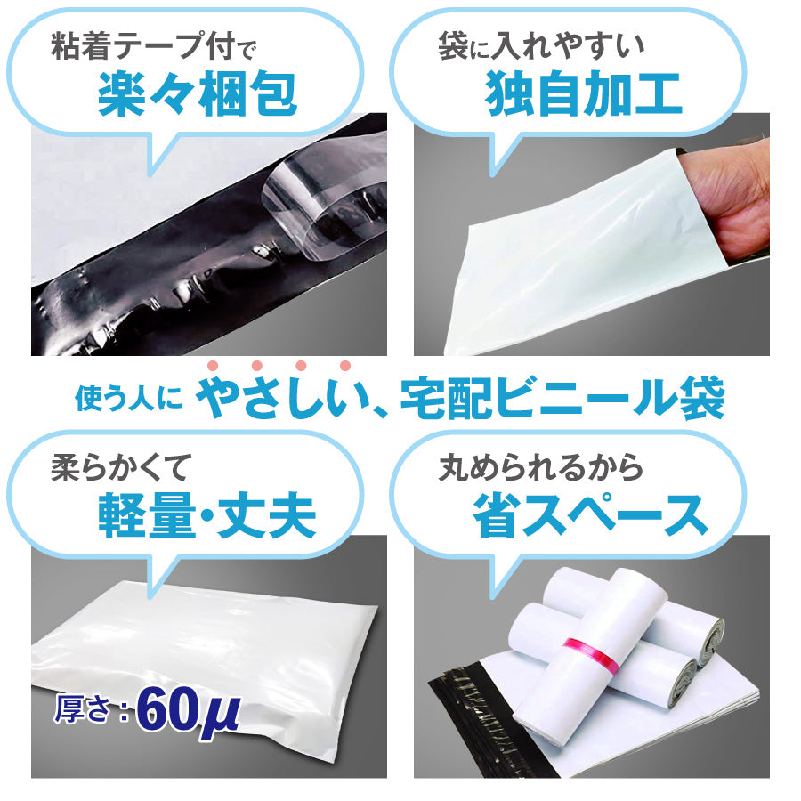 - 中身が透けない封筒ですので、梱包袋・宅配ポリ袋にぴったりなビニール袋。 封筒の口は独自加工で商品が入れやすく、梱包が楽々♪ また一度貼ったら剥がれない超強力テープが袋についているので、梱包テープがなくても楽々梱包